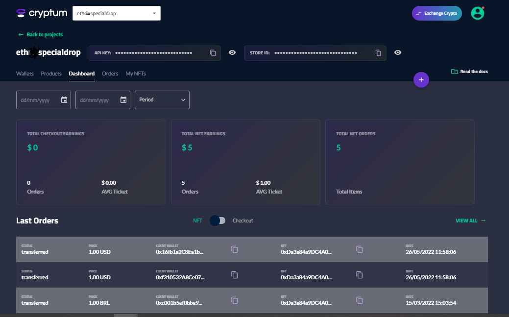 In the Dashboard view of your Store, you can have essential information such as the total received in crypto (for each asset), total in Dollars, number of NFTs connected and sold, and many other essential information for your business.
